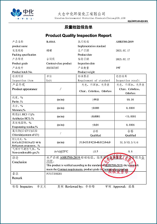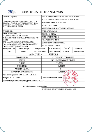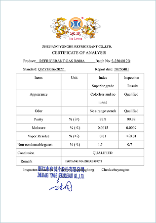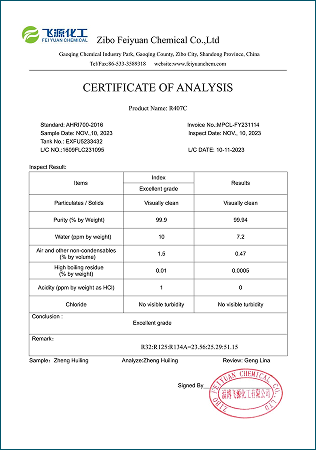 Zhejiang Yonghe Refrigerants Co. LTD / Certificate of Analysis